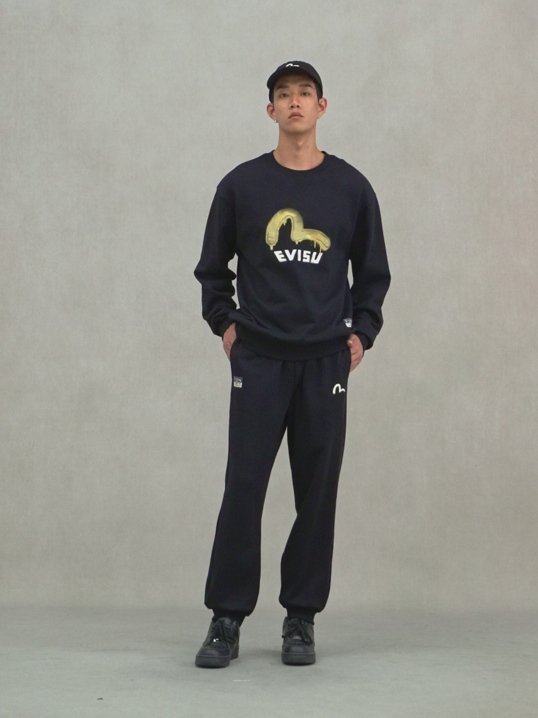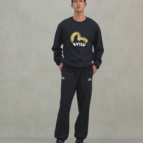 EVISU's sweatpants feature a Seagull print on the front, while the Seagull print print on the back is themed around Daruma and the Wheel of Wisdom, incorporating elements of Japanese architecture and the brand slogan, showcasing a unique cultural essence and design style.