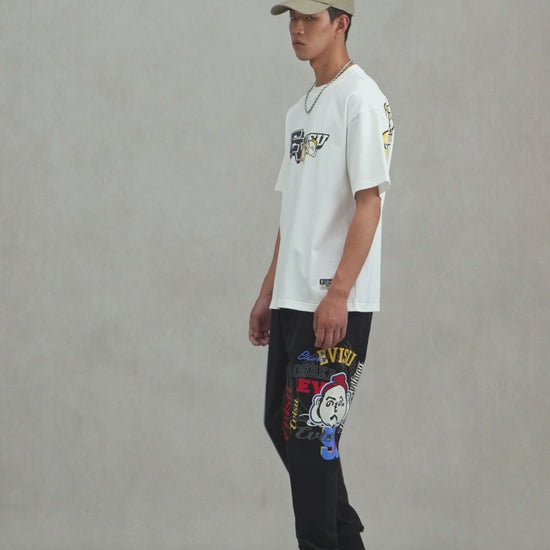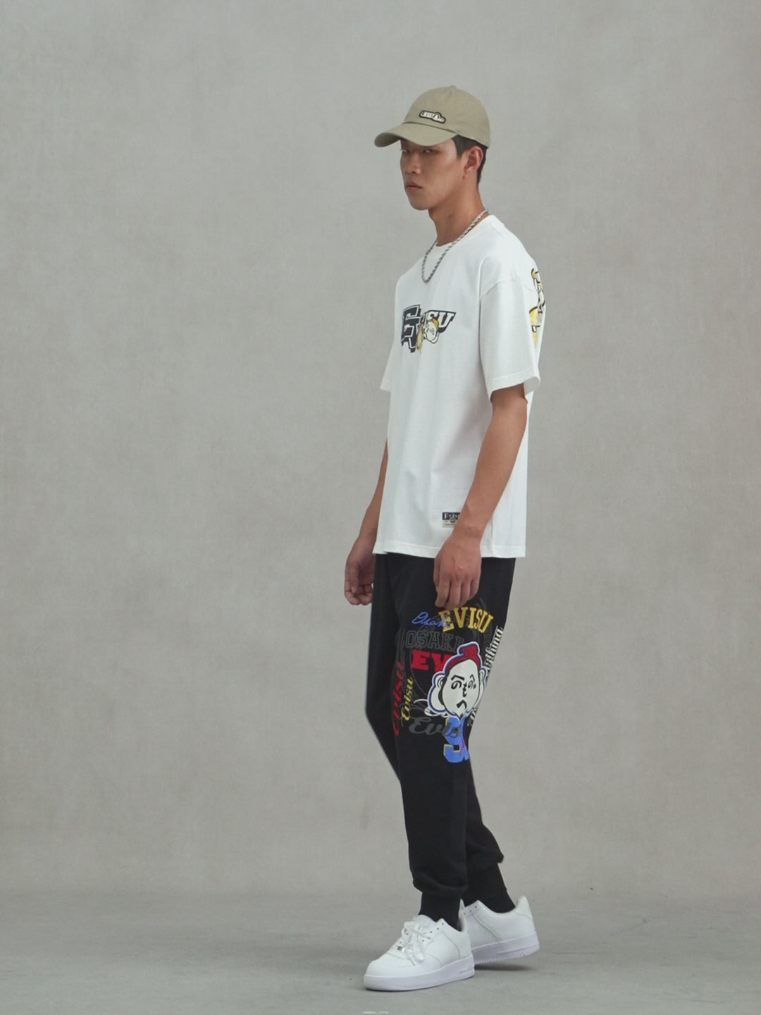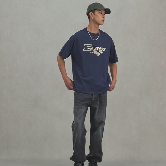 This T-shirt is crafted with a pure white base, radiating a minimalist yet avant-garde street vibe! The front is effortlessly highlighted with a striking EVISU logo print, while the back features a bold Daicock print, combining Henohenomohe Godhead, logo, and Wheel of Wisdom tag print for a perfect fusion of art and attitude.