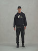 以“仙鹤报恩”为主题的运动裤,在背部大M印了智慧之轮、仙鹤和山河等元素,色彩鲜艳,设计独特,配合前面的商标刺绣,尽显品牌轻奢风格。